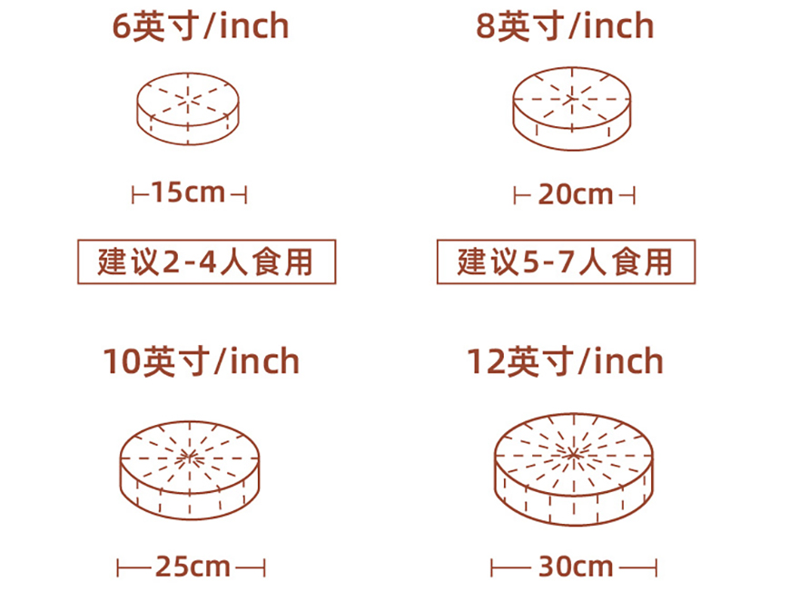 乳酪蛋糕直径23cm、糖醇蛋糕/巧克力蛋糕直径30cm(含)以上,提前两天16:00前预订。