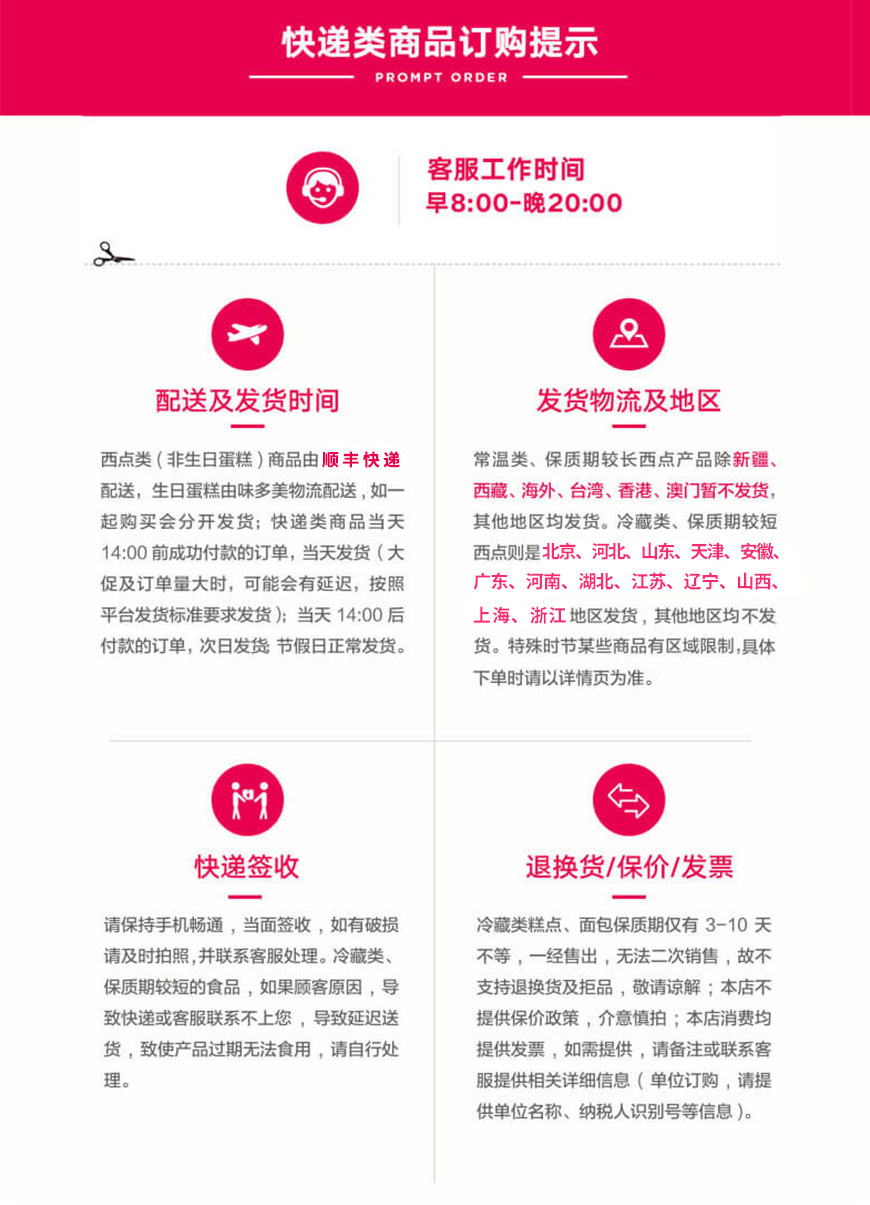 特殊款蛋糕预订时间以商品页面提示为准。