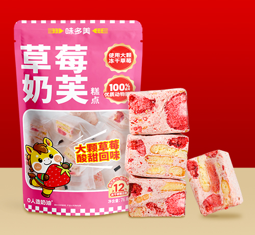 麦芽糖浆(食用玉米淀粉、水)、饼干、非油炸冻干草莓脆片≥12%、麦芽糖、全脂乳粉、动物奶油 (无水奶油) ≥5.0%、加糖炼乳、草莓粉≥2%、海藻糖、鸡蛋白粉、琼脂、食用盐